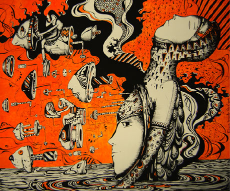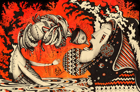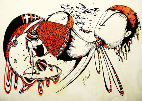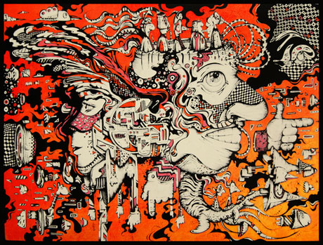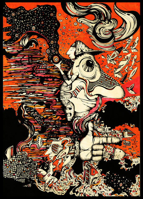 Pulpo Corporate is the AKA of Argentinan artist Fernando Herenu, whose recent work is a sunset burst of sensational surrealist imagery. Previously he had worked for the Cartoon Network and its more politically incorrect sister, Adult Swim, before he decided to leave the confines of cartooning behind him and focus on his own style. On his website Pulpo describes his art as incorporating ‘dark colours and black shape outlining, typically used in character and comic design’ but all we know is that we dig it.