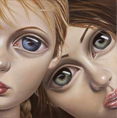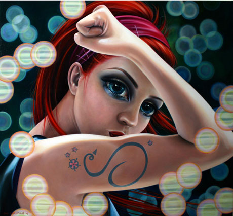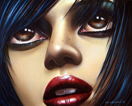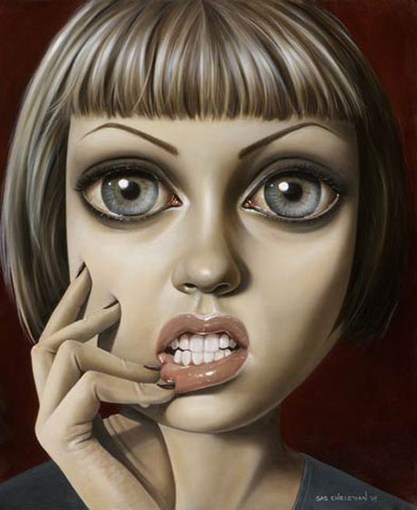 Meow! The work of Sas Christian is simply outrageously good. Her detailed paintings of shiny-eyed girls are often mistaken for photographs, or computer generated paintings they are so finely delicate. Her use of light, and the sheer shininess achieved with her brushes is jaw-dropping, and it’s easy to get sucked in and lost in those bright, wide eyes and full lips.