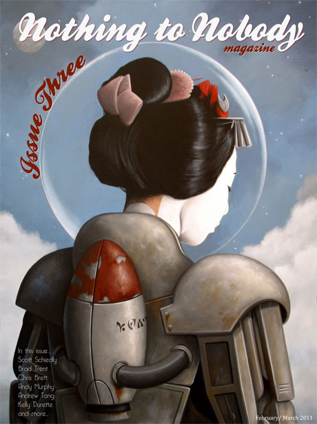 OK kids, so I seem to be forming some kind of pattern here by getting the magazine out a few days late. However we’re hoping that this time you consider us fashionably late as we pop out a beautiful new look for Nothing to Nobody. This issue we feature the very cheeky Scott Schieldy, world renowned photographer, Brad Trent; the art of Australia’s own Lily Mae Martin and Andy Murphy; Insectus fiend, Andrew Tong, the authentic Norwegian Viking, Bard Hole Standal; paint splatter King, Chris Brett; comic (and grammer) master Andrew Bargeron and many more amazingly talented people!