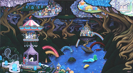There’s so much going on in each one of Nathan Spoor’s works that you could stare at them for ages and still not see everything that’s happening! Bright colours mingle with a mixture of playscapes creating murals of wonderful complexity. He’s also been featured in a ton of magazines from Juxtapose to Hi-Fructose!