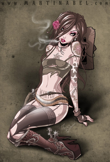 Martin Abel draws the kinda girls you want either as part of your crew if you’re a kick arse pirate captain or space adventurer, or you want to find making you pancakes in the morning (be you a boy or a girl) after a heady night of …. playing Halo or WOWC. His Pin Ups are damn hot – freeeyowww! But that’s not the only magic up his talented illustrative sleeves and he is also an amazing cartoonist creating cells in style for the likes of Xbox magazine. Check out his site for more goodness!