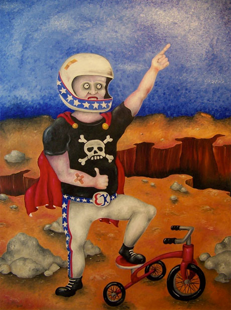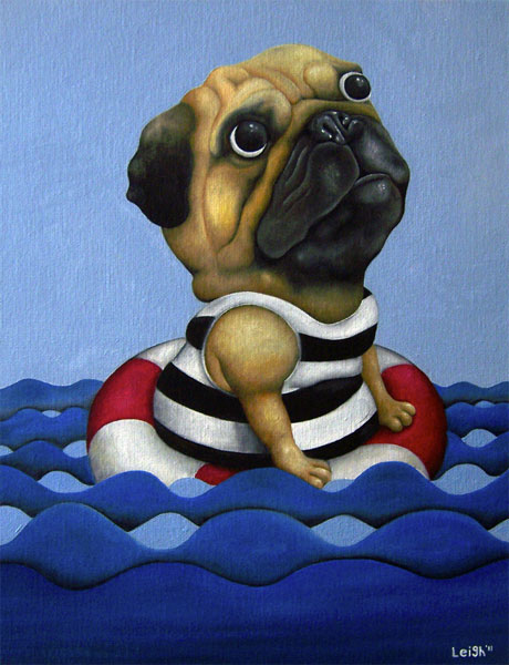 Step inside Leigh Cooney’s pop-tastic mind and view Monty Python-esque creations in bold vibrant colours. Cheeky thoughts meld with things that are a little bit cringe-y to release the awesome. Edger Alan Poe and Pugs, frisky squids and Evil Kinevil wannabes mixed together in a fat slice of goodness.
