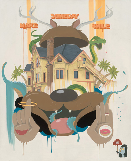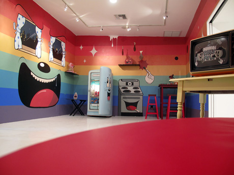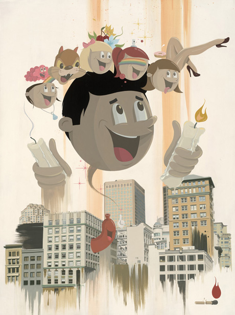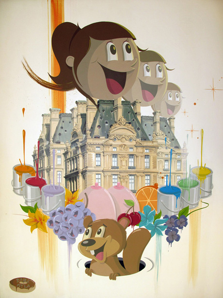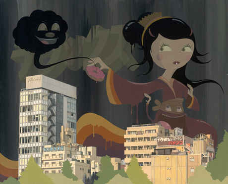 Dabs & Myla are a collaborative couple of monstrously awesome proportions! They compliment each other like cookies and cream ice-cream and their art is as delicious as a hot fudge sunday! 1950s giant faced boys and girls hulk over detailed cityscapes while crockery, fridges, milk cartons and old school TV sets can’t escape their brushes and paint.