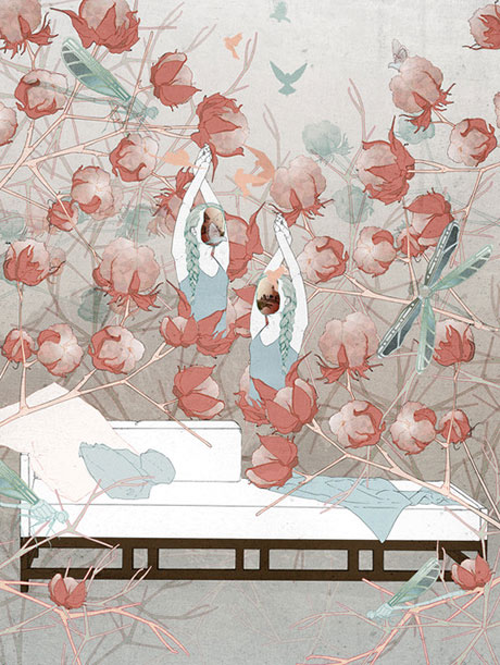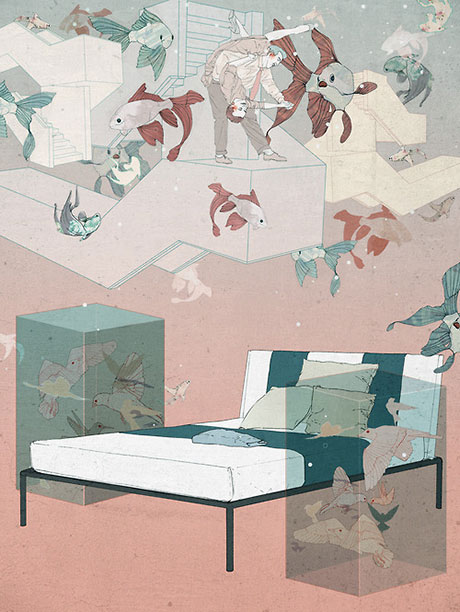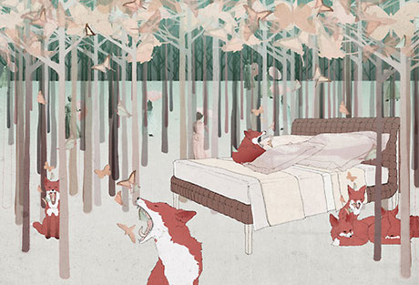 Based in Germany, Ramona Ring creates amazing fantasy worlds in muted tones, where fish swim through your bedroom and foxes kidnap your bed to make it their new home in a butterfly strewn enchanted forest. We love it!